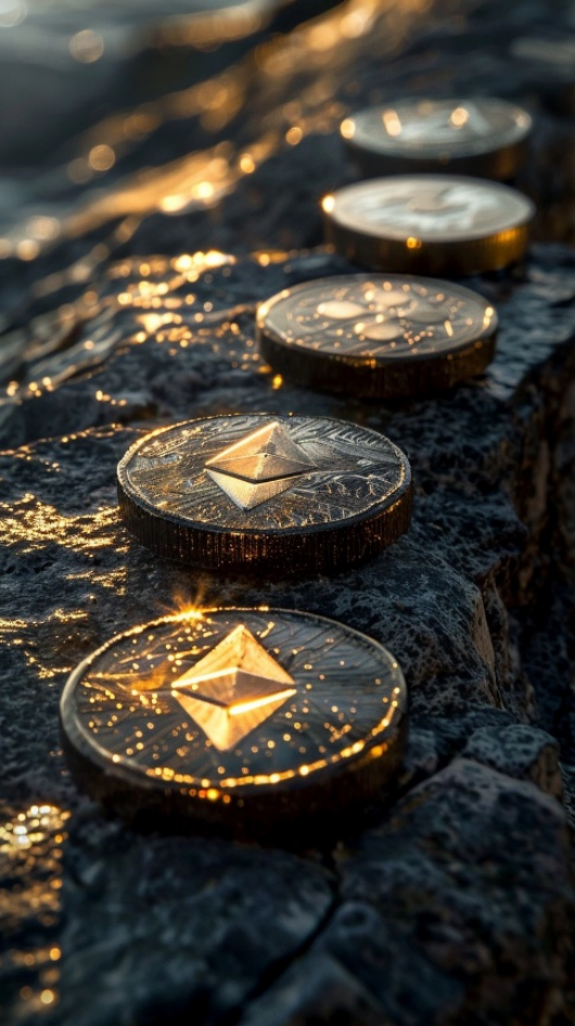 Alt-Text:Ethereum coins lined up on a rocky surface with golden reflections